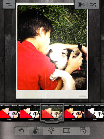 Start by uploading a photo from your gallery or take a fresh snap and you will immediately be sent to the image processing ‘studio’ or the virtual dark room. The top left corner features the cropping tool, where a simple toggle or tap, turns your image into a square profile. On the top left corner, two buttons, the activate PLUS button and the shuffle button. The former lets you buy the Pixlr-o-matic PLUS from the App Store while the latter, randomly picks an effect, overlay and frame to apply to your image.