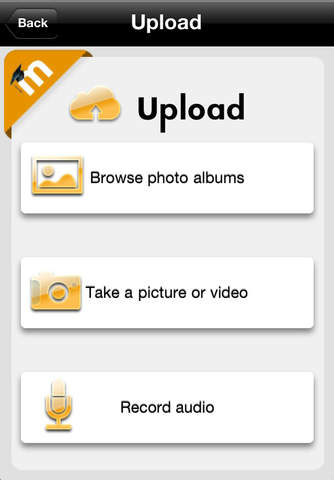 As with My Moodle, it lets you upload files to your Private File area. Given the right permission on your device, it will access the Photo album to select an existing photo to upload, take live shots using the built-in camera app and record audio.