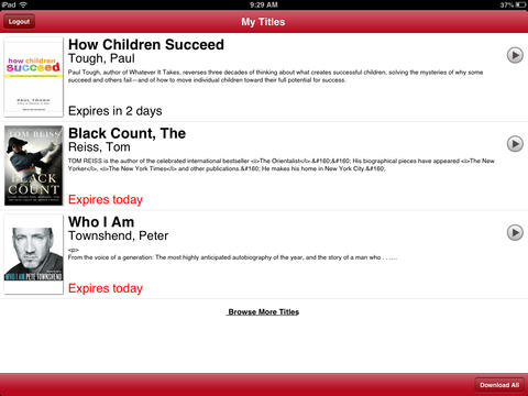 Once installed, you can access the library of eAudio books directly from the App. When you log on, it will assign you to your local library automatically. Simply click Browse more title and it will log you in automatically to the site via a web browser window.