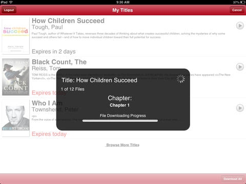 When you download is completed, drag down on the screen to refresh, and you will see the eAudio Book. You can then click on the play button, if it hasn’t downloaded the chapters, click the next track button.