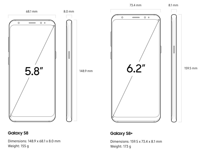 - S8+ Dimensions: 159.5 x 73.4 x 8.1 mm