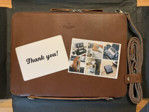 Included in the box are, the nomad organiser, the strap, a thank you card and a postcard with instructions on how to get a personal discount on your next purchase.