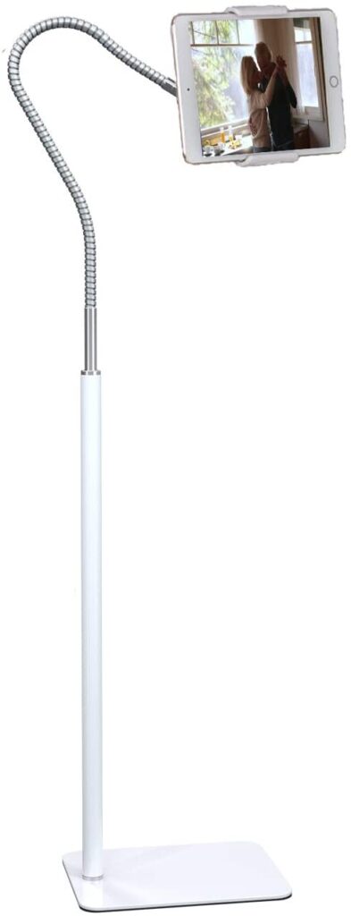 Here is another compact and portable stand, this time with a flexible gooseneck. The stand can be disassembled and packed away quickly and is available in black or white. The solid rodes make up 34.2-inch of the height while the gooseneck measures 20-inch long for a total of 54-inch. We won’t recommend this for places with high traffic for fear of being knocked over. This is because it relies on two floor base support rods. There are instructions on how to make the floor base more stable, inserting sand into the rod being one of them. The tablet clamp will take 8-12.9-inch devices but more suited for tablets up to 10-inch. Only get this if you have a need for an ultra compact stand that you can take a part and put away.