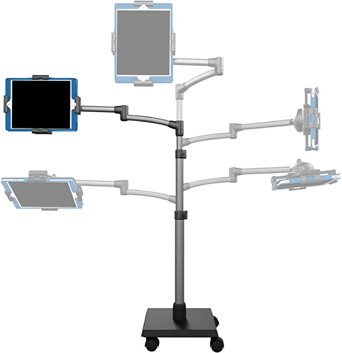 The maximum height of this next tablet stand may be limited to 44.75-inch but it is still adjustable moving from 22.1-inch to 44.75-inch. It comes with a 9.6lbs weighted base for maximum stability. There are two pivot points thanks to the three part arm. At the end of the arm is a tablet clamp with a joint that lets you face the device up or down. Suitable for devices with 7-inch to 13-inch display, if you have a need for a strong stand with swivel arm, the idee is one for you. Note that you are getting an arms height stand and not a full head height stand like those that goes up to 60-inch tall.